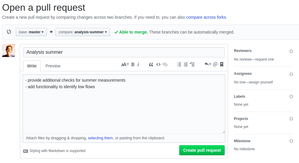 Add information about the Pull request, add reviewers, labels,… Finally, Create pull request:
